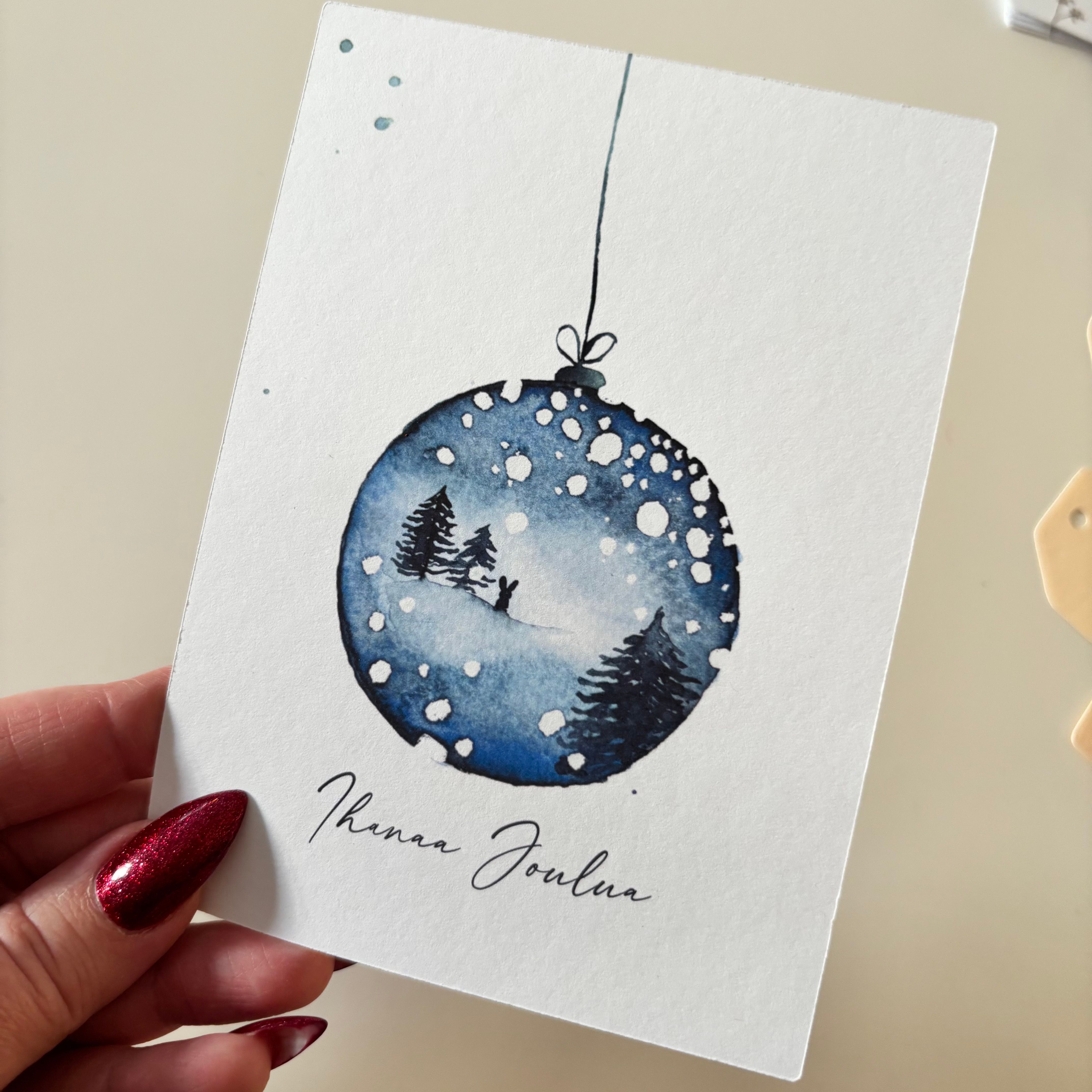 Tämä joulukortti on printti alkuperäisestä vesivärimaalauksesta. Pehmeät värit, elävä sivellinjälki ja orgaaninen tunnelma tekevät kortista rauhallisen ja ajattoman - vastapainon kiireelle ja yliyrittämiselle. Täydellinen joulukortti kun haluat antaa jotian kaunista mutta mutkatonta.